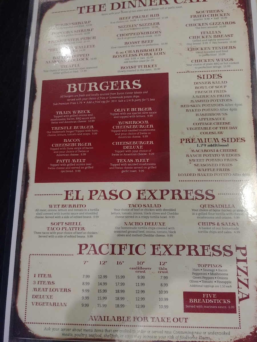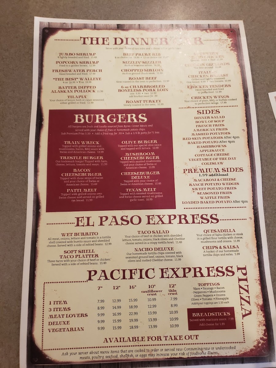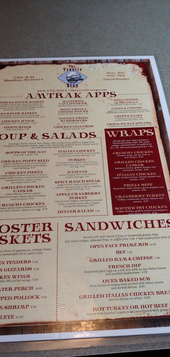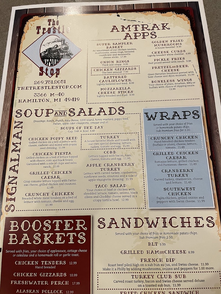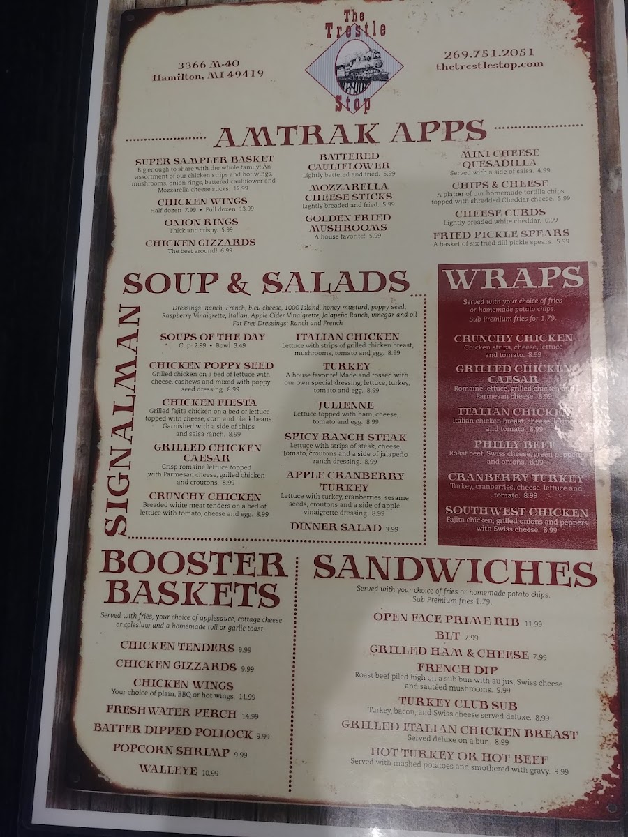 The Trestle Stop Menu offers a delightful mix of comfort food and local favorites, making it a go-to spot for both locals and visitors in Hamilton, MI. Located at 3366 M-40, this charming eatery brings a warm and welcoming atmosphere, where each dish is carefully crafted to satisfy your cravings. Whether you're in the mood for a hearty breakfast to kick-start your day or a satisfying lunch that hits the spot, their menu is designed to please all tastes.